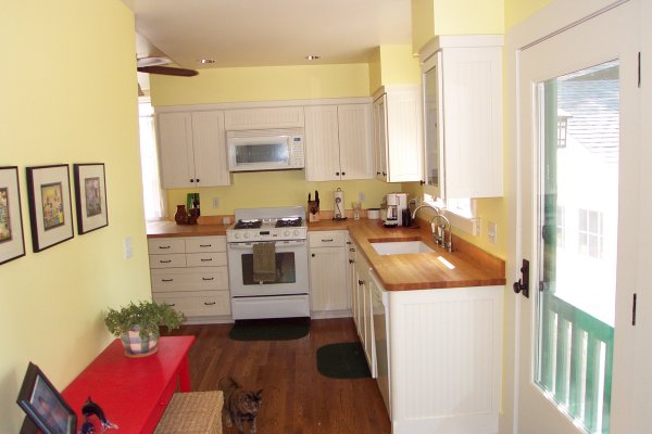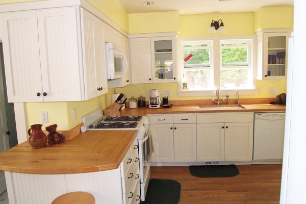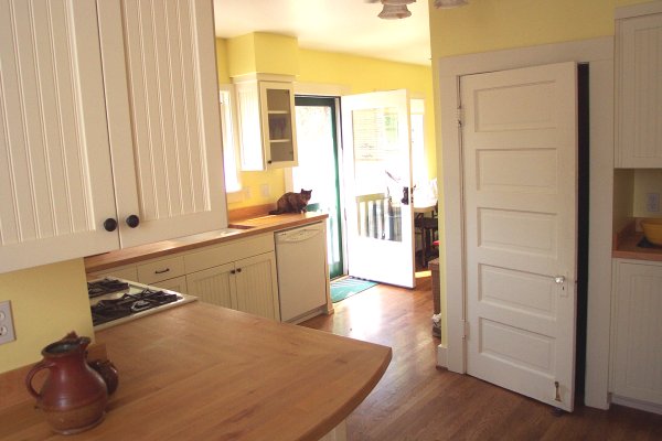 Remodeling the kitchen helped bring light into this part of the house. We installed oak floors, beadboard cabinets and a butcher block countertop. The new opening from the dining room helps the entire area flow together.