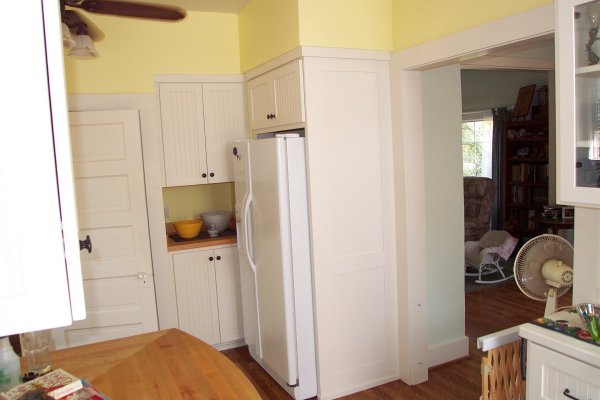 With the odd shape for the kitchen, the question was what to do with the refrigerator. The problem was solved when we used the space behind the chimney and built-in a pantry area next to the basement door.