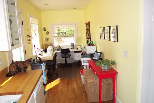 The kitchen is now large and bright and the energy flows well, all the way into the sewing area.